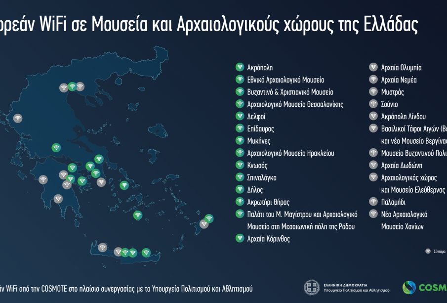 Δωρεάν ασύρματο Internet θα είναι πλέον διαθέσιμο στους επισκέπτες πολύ σημαντικών αρχαιολογικών χώρων, στο πλαίσιο της συνεργασίας του Υπουργείο Πολιτισμού και Αθλητισμού με την COSMOTE για την παροχή δωρεάν WiFi σε μεγάλους αρχαιολογικούς χώρους και μουσεία της Ελλάδας. Με την επέκταση του μνημονίου συνεργασίας ανάμεσα στα δύο μέρη, έχουν επιλεγεί από το Υπουργείο Πολιτισμού και Αθλητισμού συνολικά 25 σημεία υψηλού πολιτιστικού και ιστορικού ενδιαφέροντος. Η COSMOTE ήδη προσφέρει δωρεάν ασύρματες ευρυζωνικές υπηρεσίες σε δεκατρείς χώρους πολιτιστικού ενδιαφέροντος, ενώ συνεχίζει τη δημιουργία υποδομών και στους υπόλοιπους χώρους, με τη συνολική επένδυση της εταιρείας να ξεπερνά τα 3 εκατ. ευρώ.