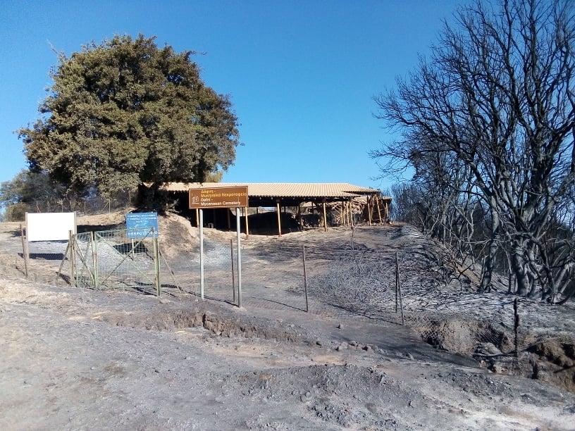 Κατόπιν αυτοψίας που πραγματοποιήθηκε σήμερα, Πέμπτη 10 Σεπτεμβρίου 2020, από αρχαιολόγους και αρχαιοφύλακες της Εφορείας Αρχαιοτήτων Ηλείας στο νεκροταφείο μυκηναϊκών χρόνων στην Τ.Κ Δάφνης του Δήμου Ήλιδας, διαπιστώθηκε ότι η φωτιά που εκδηλώθηκε στην περιοχή, σταμάτησε στα όρια της περίφραξης του αρχαιολογικού χώρου, ο οποίος λόγω και της συστηματικής αποψίλωσης που είχε γίνει την προηγούμενη περίοδο δεν υπέστη καμία φθορά. Κατά την ανωτέρω αυτοψία διαπιστώθηκε μόνο φθορά σε ένα από τα τρία ξύλινα στέγαστρα του χώρου λόγω του υψηλού θερμικού φορτίου.