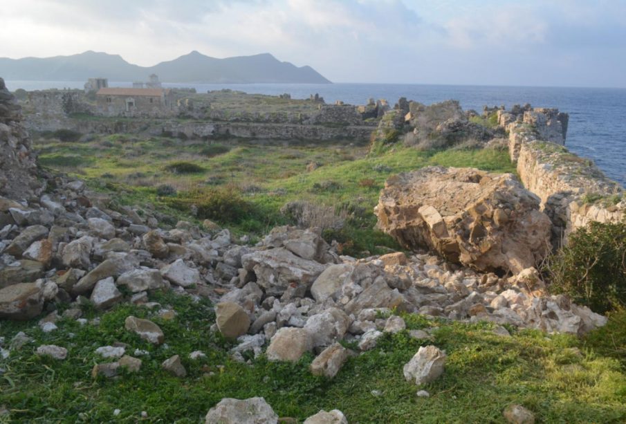 Κατάρρευση τμημάτων τοιχοποιίας στον ημικυκλικό πύργο του βορείου περιβόλου (ακρόπολη) του κάστρου Μεθώνης