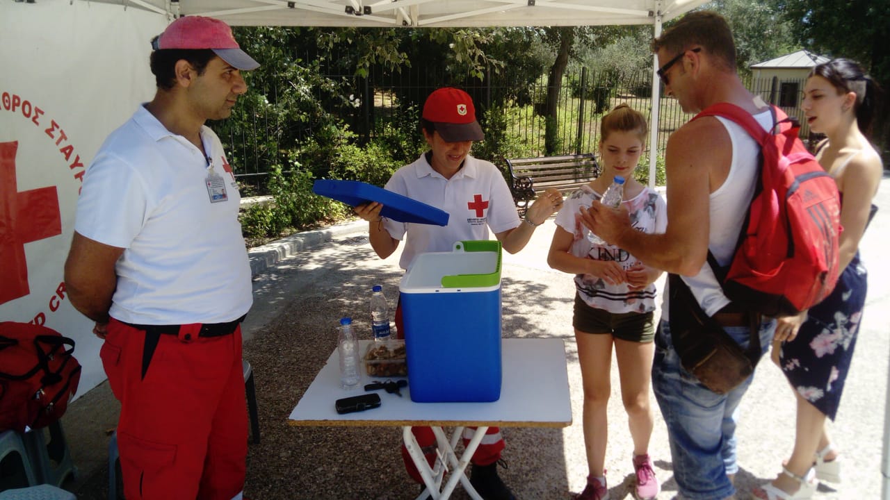 Τρίτη, Πέμπτη και Σαββατοκύριακα, οπότε και η μεγαλύτερη επισκεψιμότητα της Ακρόπολης, στη Δ. Αρεοπαγίτου ποδηλάτες με εξοπλισμό του Ελληνικού Ερυθρού Σταυρού προσφέρουν εμφιαλωμένο νερό στους επισκέπτες.