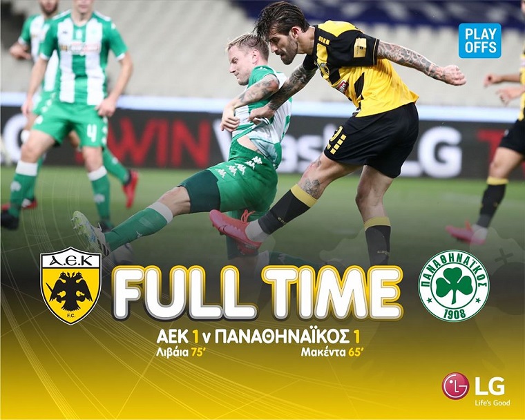 Ο Παναθηναϊκός προηγήθηκε στο 65′ με πλασέ του Φεντερίκο Μακέντα και η ΑΕΚ απάντησε στο 76′ με ωραίο συρτό σουτ του Μάρκο Λιβάια από πλάγια αριστερά.