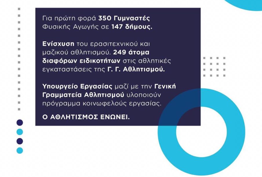 Οι 350 θέσεις εξ αυτών, στηρίζοντας εμπράκτως και για πρώτη φορά τόσο εμφατικά τους γυμναστές, θα αφορούν σε αποφοίτους Φυσικής Αγωγής για 147 Δήμους σε όλη την Ελλάδα. Γυμναστές, οι οποίοι θα ενισχύσουν τον ερασιτεχνικό, μαζικό, αθλητισμό.
