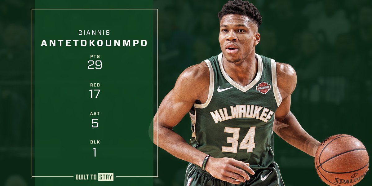 29 PTS | 17 REB | 5 AST | 68% FG | 31 MIN #FearTheDeer | #Giannis pic.twitter.com/KKR1X064lJ