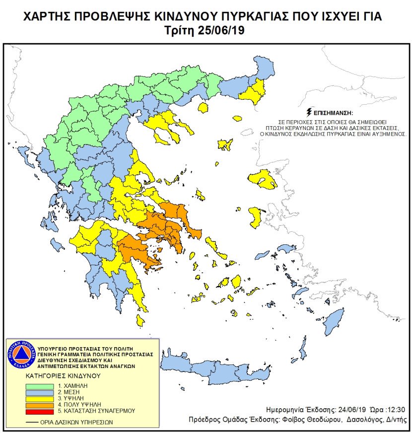 Σύμφωνα με το Χάρτη Πρόβλεψης Κινδύνου Πυρκαγιάς που εκδίδει η Γενική Γραμματεία Πολιτικής Προστασίας του Υπουργείου Προστασίας του Πολίτη (www.civilprotection.gr), για αύριο Πέμπτη 27 Ιουνίου 2019, προβλέπεται πολύ ...Πολύ υψηλός κίνδυνος πυρκαγιάς (κατηγορία κινδύνου 4) για σήμερα Τετάρτη 26/6