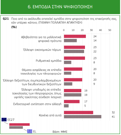 Στη λίστα των εμποδίων, που αντιμετωπίζουν στην πορεία προς την ψηφιοποίηση τόσο οι ελληνικές, όσο και οι ευρωπαϊκές εταιρείες, συμπεριλαμβάνονται τα ρυθμιστικά εμπόδια (8% για την Ελλάδα και 23% για την Ε.Ε.). Επίσης, αντιμετωπίζουν ως σημαντικό πρόβλημα την ψηφιακή ασφάλεια (με ποσοστό 8% στην Ελλάδα και 20% στην Ε.Ε.).