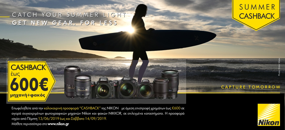 Επωφεληθείτε από την καλοκαιρινή προσφορά “CASHBACK” της ΝΙΚΟΝ με άμεση επιστροφή χρημάτων έως €600 σε αγορά συγκεκριμένων φωτογραφικών μηχανών Nikon και φακών NIKKOR, σε επιλεγμένα καταστήματα. Η προσφορά ισχύει από Πέμπτη 13/06/2019 έως και Σάββατο 14/09/2019.