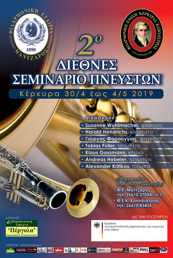 Η Φιλαρμονική Εταιρεία «Μάντζαρος» και η Φιλαρμονική Ένωση «Καποδίστριας» συνδιοργανώνουν για δεύτερη χρονιά το πολύ πετυχημένο Διεθνές Σεμινάριο Πνευστών Οργάνων στην Κέρκυρα, στο οποίο θα διδάξουν διακεκριμένοι Γερμανοί σολίστ και καθηγητές πνευστών, όλοι τους μέλη της Φιλαρμονικής Ορχήστρας του Έσσεν.