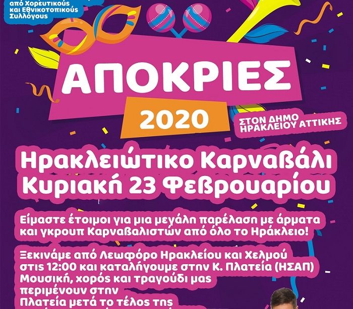 Οι φετινές Αποκριές στον Δήμο Ηρακλείου Αττικής κορυφώνονται με τη μεγάλη παρέλαση του Καρναβαλιού, την Κυριακή 23 Φεβρουαρίου. Εκκίνηση στις 12.00 το μεσημέρι στην διασταύρωση της λεωφόρου Ηρακλείου με την οδό Χελμού, από όπου άρματα και ομάδες καρναβαλιστών θα διασχίσουν την Ηρακλείου για να καταλήξουν στην κεντρική πλατεία της πόλης. Εκεί θα στηθεί ένα ξέφρενο πάρτι με χορό και τραγούδι για όλους, γκρουπ και θεατές, στους ρυθμούς της μουσικής του συγκροτήματος Santa Palabra.