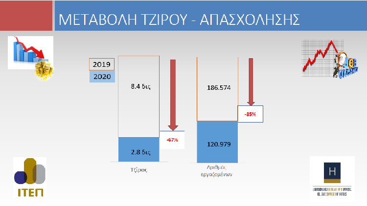 2. Οι ξενοδόχοι ανοίγουν τις επιχειρήσεις τους με πλήρη συναίσθηση των δυσκολιών που αντιμετωπίζουν. Συγκεκριμένα, διαβλέπουν πτώση του τζίρου κατά μ.ο. 67% (από τα 8,4 δις ευρώ το 2019 στα 2,8 δις ευρώ το 2020, συνολική απώλεια 5,6 δις) και κάμψη της απασχόλησης κατά 35% (από 186.574 εργαζόμενους το 2019 στους 120.979 εργαζόμενους το 2020).