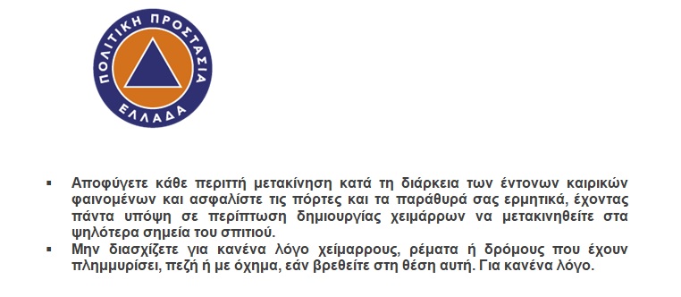 Για περισσότερες πληροφορίες και οδηγίες αυτοπροστασίας από τα έντονα καιρικά φαινόμενα, οι πολίτες μπορούν να επισκεφθούν την ιστοσελίδα της Γενικής Γραμματείας Πολιτικής Προστασίας στην ηλεκτρονική διεύθυνση www.civilprotection.gr.