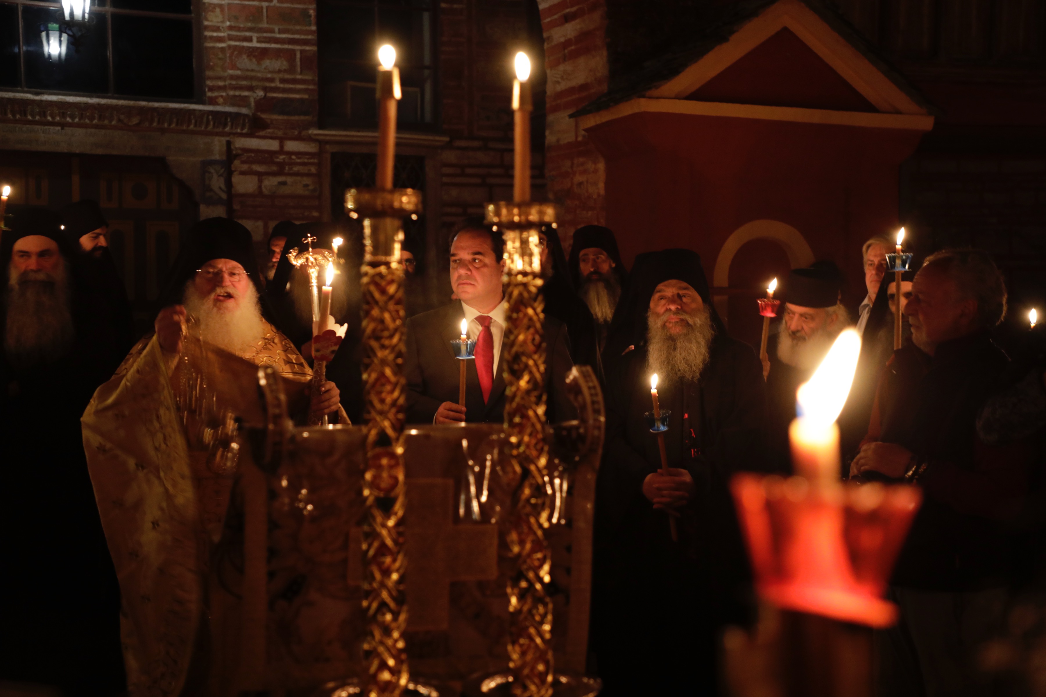 Με λαμπρότητα και σύμφωνα με το αγιορείτικο βυζαντινό τυπικό γιορτάστηκε η Ανάσταση του Χριστού στην Ιερά Μονή Βατοπαιδίου, παρουσία του διοικητή του Αγίου Όρους Κωνσταντίνου Δήμτσα.