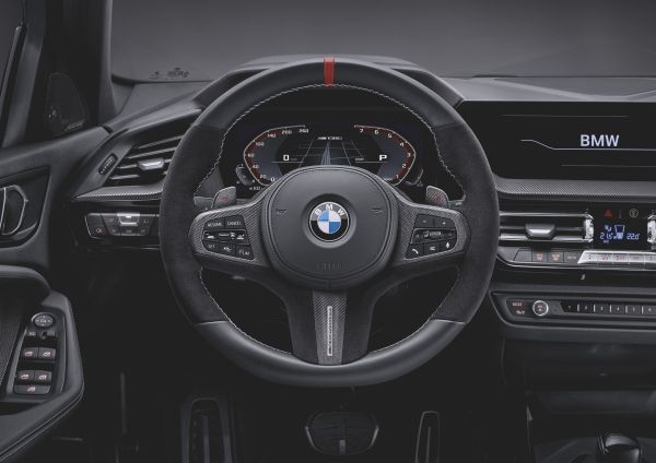 Ξεχωριστές πινελιές αναβάθμισης του σπορ στυλ διατίθενται και για το εσωτερικό της νέας BMW Σειράς 1. Μεταξύ άλλων, το τιμόνι M Performance με ευδιάκριτες περιοχές λαβής σε επένδυση Alcantara και μεγάλες υποδοχές για τους αντίχειρες υπόσχεται μία γνήσια αγωνιστική αίσθηση. Εκτός από την ευχάριστη αφή σε συνδυασμό με την τέλεια λαβή, αξιοσημείωτη είναι η κόκκινη σήμανση στην πάνω θέση και η γκρι ασημί χειροποίητη σταυρωτή ραφή. Ο τεχνολογικά προηγμένος χαρακτήρας του τιμονιού ενισχύεται με το ένθετο M Performance, το οποίο διατίθεται σε ανθρακόνημα/Alcantara και ανθρακόνημα/δέρμα. Και στις δύο περιπτώσεις, υπάρχει δεξιά ένα ένθετο λογότυπο M Performance. Για μοντέλα με σπορ κιβώτιο Steptronic, προσφέρονται υψηλής ποιότητας ανθρακονημάτινα shift paddles M Performance που προάγουν την αγωνιστική ατμόσφαιρα στο cockpit.
