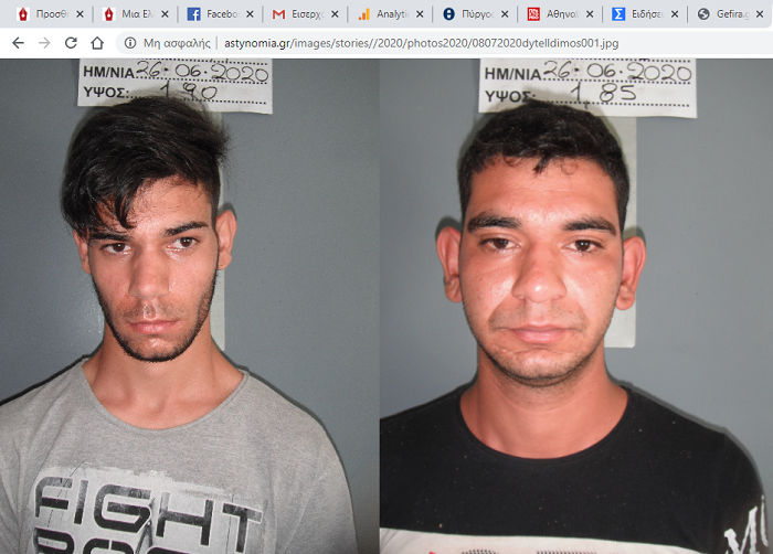 Δίνονται στη δημοσιότητα, κατόπιν σχετικής Διάταξης της Εισαγγελίας Πρωτοδικών Ηλείας, τα στοιχεία ταυτότητας, οι φωτογραφίες καθώς και η ασκηθείσα σε βάρος τους ποινική δίωξη δύο αλλοδαπών ανδρών, που συνελήφθησαν την 25-6-2020 από αστυνομικούς της Υποδιεύθυνσης Ασφάλειας Πύργου