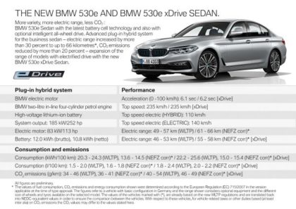 Η κατασκευάστρια εταιρία πολυτελών οχημάτων BMW αυξάνει την απόδοση, απήχηση και ποικιλία των ηλεκτροκίνητων μοντέλων της στην ανώτερη μεσαία κατηγορία. Η τελευταία τεχνολογία κυψελών καυσίμου συμβάλλει στην αύξηση της ηλεκτρικής αυτονομίας της plug-in υβριδικής έκδοσης BMW 530e Sedan μεταξύ 61 και 66 km*. Επιπλέον, η τελευταία γενιά της τεχνολογίας BMW eDrive έχει μειώσει την κατανάλωση καυσίμου και εκπομπών CO2 στο μικτό κύκλο πάνω από 20%, από 1.8 – 1.6 l/100 km* καθώς και κατά 41 – 36 g/km*. Η συνδυασμένη κατανάλωση ηλεκτρικής ενέργειας της BMW 530e Sedan είναι τώρα 14,5 – 13,6 kWh/100 km*. Παράλληλα με το λανσάρισμα της BMW 530e Sedan, διατίθεται επίσης άμεσα η BMW 530e xDrive Sedan (κατανάλωση καυσίμου στο μικτό κύκλο: 2.2 – 2.0 l/100 km, συνδυασμένη κατανάλωση ηλεκτρικής ενέργειας: 15,4 – 15,0 kWh/100 km, εκπομπές CO2 στο μικτό κύκλο: 49 – 46 g/km), που συνδυάζει το προηγμένο, plug-in υβριδικό σύστημα με ευφυή τετρακίνηση.