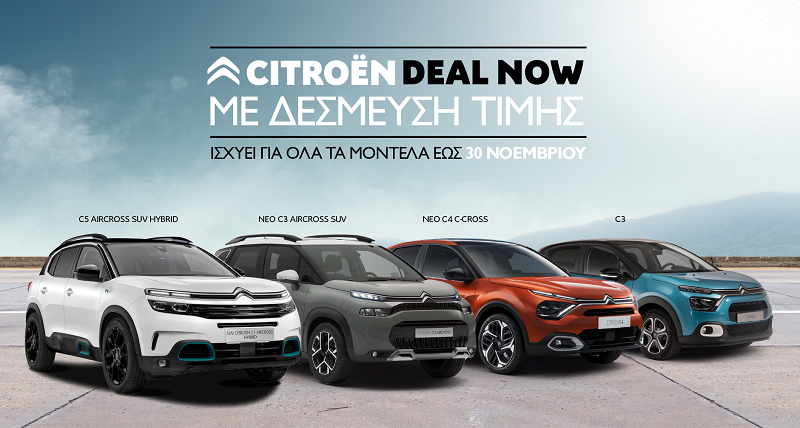 Η Citroën Hellas αντιλαμβανόμενη τις ιδιαίτερες συνθήκες που επικρατούν στην αγορά αυτοκινήτου, με το πρόγραμμα “CITROËN DEAL NOW”, δίνει τη δυνατότητα στους πελάτες της Μάρκας που προβαίνουν σε παραγγελία να “δεσμεύσουν” τη λιανική τιμή αγοράς.