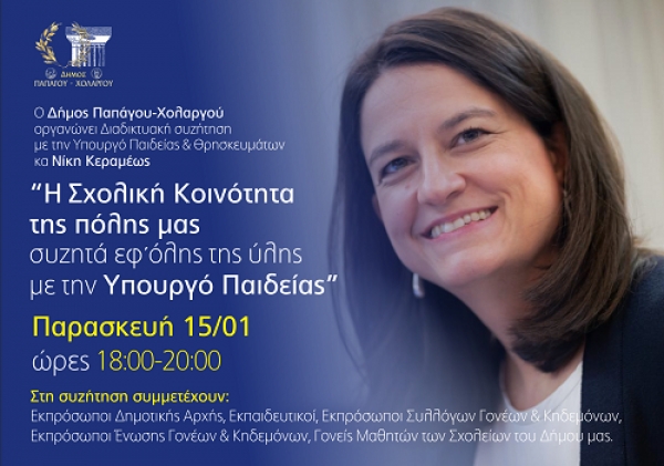 Ο Δήμος Παπάγου – Χολαργού οργανώνει διαδικτυακή συζήτηση με την Υπουργό Παιδείας και Θρησκευμάτων κα. Νίκη Κεραμέως. Η σχολική κοινότητα της πόλης μας θα συζητήσει εφ’ όλης της ύλης με την υπουργό παιδείας την Παρασκευή 15 Ιανουαρίου από τις 18.00 έως και τις 20.00 το απόγευμα.
