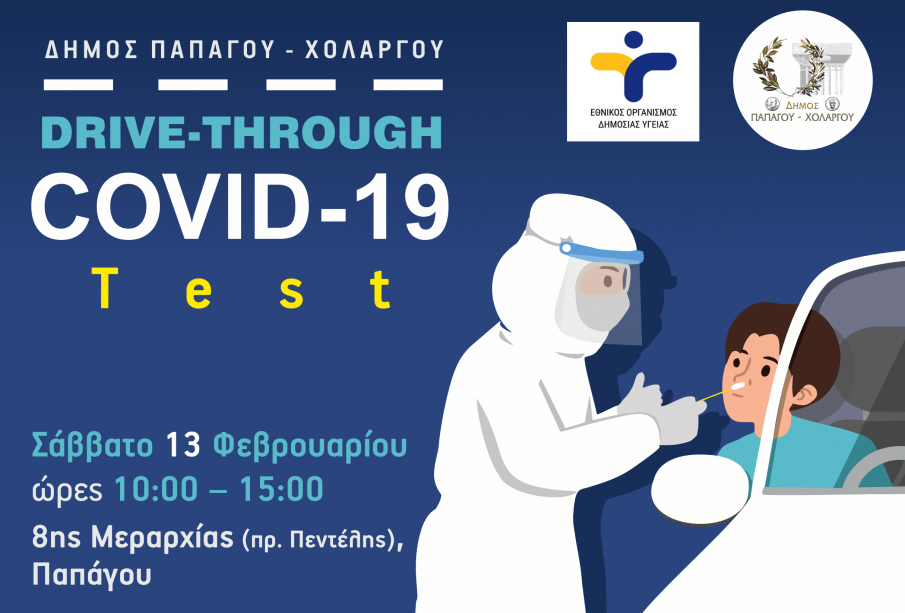 Ο Δήμος Παπάγου – Χολαργού σε συνεργασία με τον Εθνικό Οργανισμό Δημόσιας Υγείας, προχωρά στη διενέργεια drive through rapid tests, δωρεάν για τους κατοίκους της πόλης μας, το Σάββατο 13 Φεβρουαρίου 2021 και ώρες 10.00 έως 15.00, στην οδό 8ης Μεραρχίας Παπάγου (πρώην Πεντέλης).
