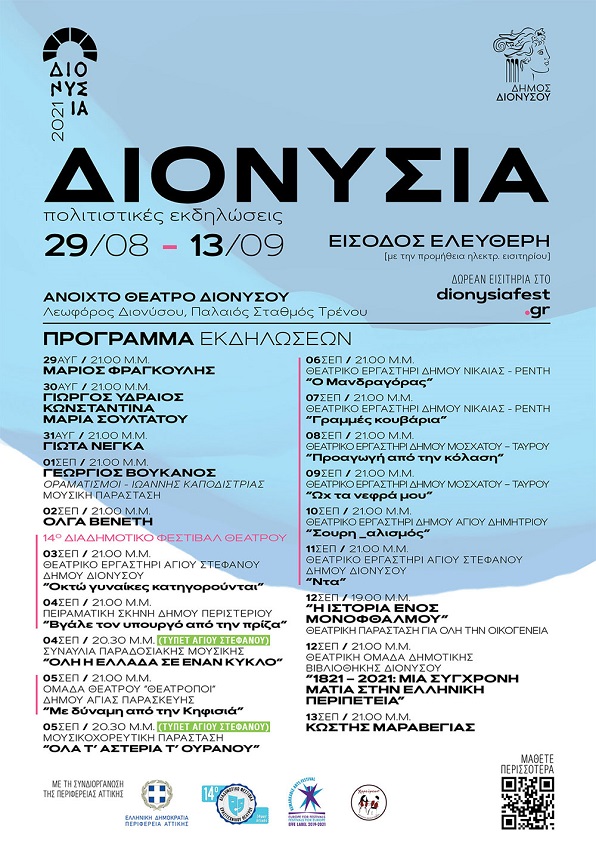 Ο Δήμος Διονύσου σας προσκαλεί στα «ΔΙΟΝΥΣΙΑ 2021», ένα μοναδικό πολιτιστικό και ψυχαγωγικό υπερθέαμα που αναμένεται να ικανοποιήσει και τα πιο απαιτητικά γούστα και το οποίο περιλαμβάνει μεγάλες συναυλίες και μουσικές παραστάσεις αγαπημένων καλλιτεχνών (Μάριος Φραγκούλης, Γιώτα Νέγκα, Κωστής Μαραβέγιας, Γιώργος Υδραίος, Κωνσταντίνα, Μαρία Σουλτάτου, Όλγα Βενέτη, Γεώργιος Βούκανος), Διαδημοτικό Φεστιβάλ Ερασιτεχνικού θεάτρου Δήμων Αττικής (το 14ο κατά σειρά, με 9 παραστάσεις θεατρικών ομάδων των Δήμων Διονύσου, Περιστερίου, Αγίας Παρασκευής, Νίκαιας-Ρέντη, Μοσχάτου-Ταύρου και Αγίου Δημητρίου), παιδική θεατρική παράσταση για όλη την οικογένεια, θεατρικό δρώμενο για το 1821 του Προγράμματος Θεατρικής Επιμόρφωσης της «Δημοτικής Βιβλιοθήκης Διονύσου» και διήμερο εκδηλώσεων αφιερωμένο στην ελληνική παράδοση, με συναυλία παραδοσιακής μουσικής και μουσικοχορευτική παράσταση.