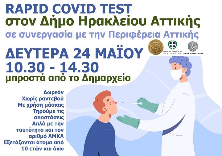 Δωρεάν rapid covid tests δράση Μαΐου στον Δήμο Ηρακλείου Αττικής: Δευτέρα 24/5 10.30 – 14.30 έξω από το δημαρχείο