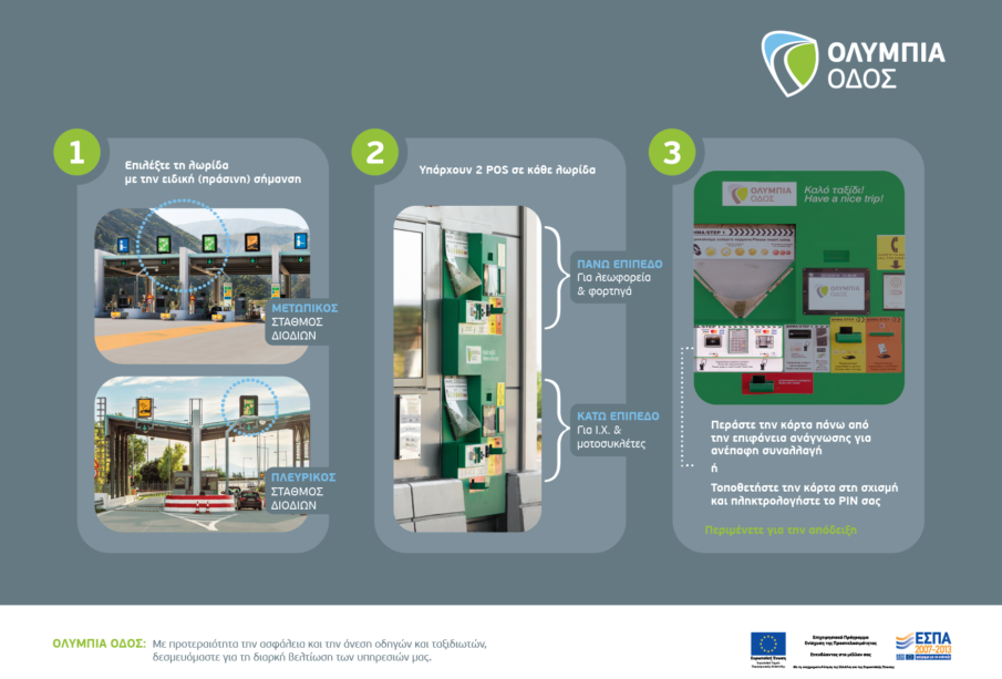 Δείτε στο συνημμένο αρχείο ή στο www.olympiaodos.gr οδηγίες για τον τρόπο χρήσης των POS στις λωρίδες με Μηχάνημα Αυτόματης Πληρωμής.