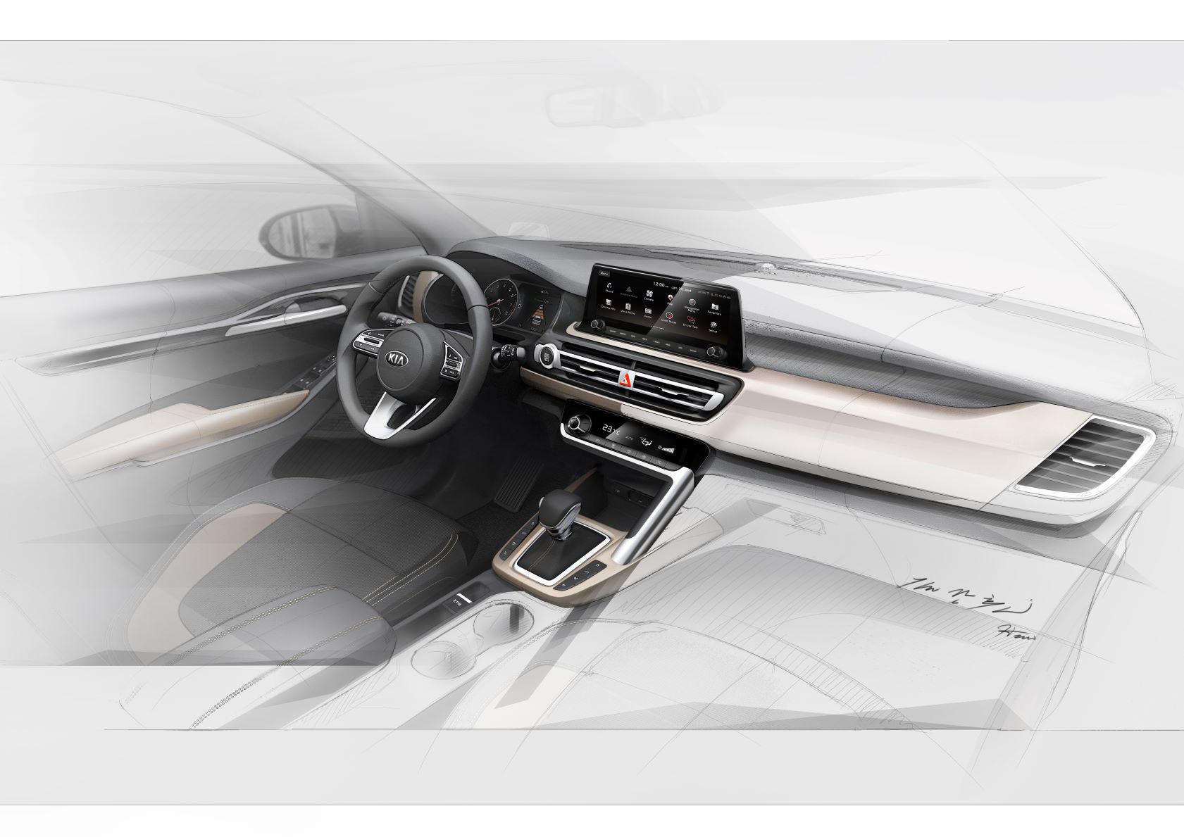 Η Kia Motors αποκαλύπτει σκίτσα που δείχνουν τον εσωτερικό διάκοσμο του νέου κόμπακτ SUV της μάρκας, το οποίο θα αποκαλυφθεί πλήρως αυτό το καλοκαίρι. Με τολμηρή σχεδίαση και υψηλής ποιότητας υλικά κατασκευής δημιουργείται μία νεανική και πολυτελής ατμόσφαιρα. Ελκυστικές λεπτομέρειες, όπως το μεταλλικό φινίρισμα στους αεραγωγούς και σε διάφορα σημεία του ταμπλό και του τιμονιού, προσδίδουν ένα σύγχρονο στιλ που αναζητούν οι νέοι αγοραστές με τεχνολογικές πεποιθήσεις.