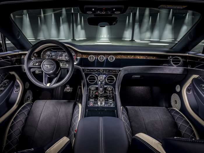 Καπιτονέ δερμάτινες ταπετσαρίες με αδαμάντινο μοτίβο, κεντητά προσκέφαλα Speed, συνδυασμός δέρματος και Alcantara στο τιμόνι και σε άλλα σημεία της καμπίνας, είναι μερικές μόνο από τις ιδιαίτερου design λεπτομέρειες του εσωτερικού. Συμπληρώνονται από καπλαμά σε Piano Black στον βασικό εξοπλισμό ενώ οι αποχρώσεις Dark Stain Burr Walnut, Dark Fiddleback Eucalyptus και Crown Cut Walnut, προσφέρονται χωρίς επιπλέον κόστος.