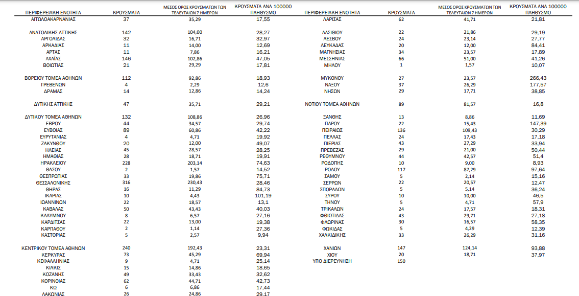 Η γεωγραφική κατανομή των 3.493 κρουσμάτων. 927 στην Αττική(ΠΙΝΑΚΑΣ)