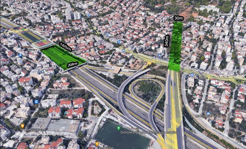 - Φωτογραφία από google Earth (σε pdf) με τον προτεινόμενο ενιαίο χώρο πρασίνου και αθλητισμού συνολικής έκτασης περίπου 65.000 τ.μ. !!!! (Η εμβαδομέτρηση έγινε με το google Earth pro).