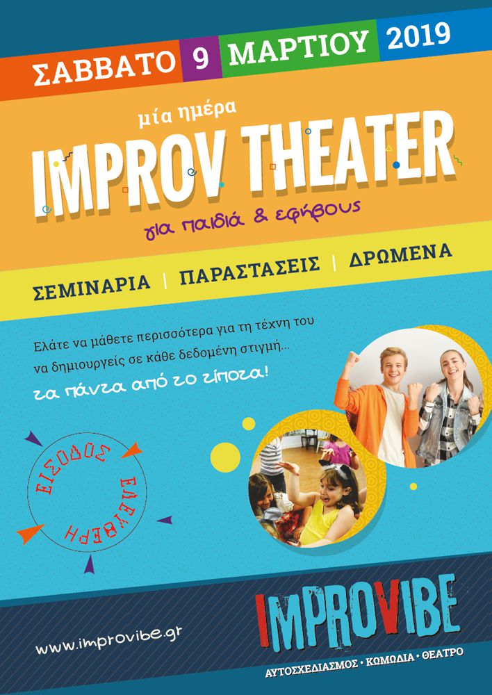 Το improv Theater είναι μια μορφή θεατρικής τέχνης όπου τα πάντα δημιουργούνται επί σκηνής. Δεν υπάρχει τίποτα προσχεδιασμένο και οι ηθοποιοί καλούνται να αυτοσχεδιάσουν, έχοντας, συνήθως, για έμπνευση μια πρόταση από το κοινό. Η ημέρα αυτή είναι μια ευκαιρία για τα παιδιά και τους γονείς να γνωρίσουν από κοντά τα οφέλη αυτής της ιδιαίτερης μορφής τέχνης.