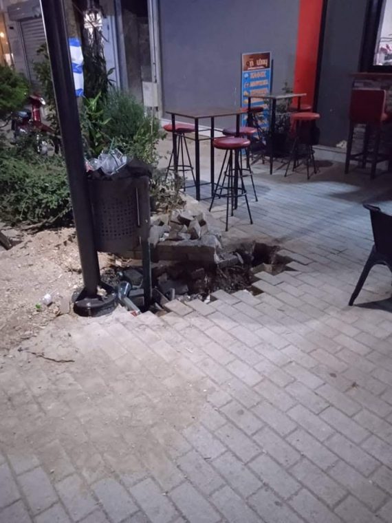 Πληροφορήθηκα ότι ένας συμπολίτης είχε ατύχημα στα “έργα” του Δημάρχου για την ανάπλαση του πεζόδρομου, στην οδό Σμύρνης. Έπεσε στο σημείο της φωτογραφίας όπου βρίσκονται “πλίνθοι και κέραμοι ατάκτως ερρημμένοι”, χτύπησε στα δάκτυλα και στο χέρι. Μέσα απ’ την καρδία μου του εύχομαι γρήγορα περαστικά.