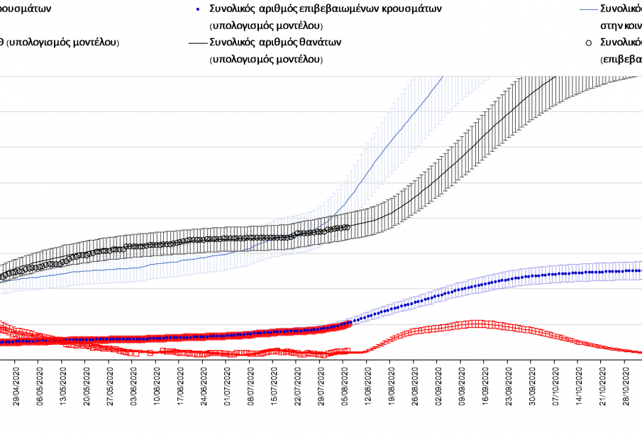 Με βάση αυτές τις προβλέψεις, διαφαίνεται μια συνεχής αύξηση των κρουσμάτων, η οποία έχει ήδη ξεπεράσει τα 150 νέα κρούσματα την ημέρα, και η οποία εάν δεν ανακοπεί με την αυστηρή εφαρμογή των μέτρων που έχουν προταθεί τις προηγούμενες ημέρες (χρήση μάσκας σε εσωτερικούς χώρους, μέγιστος αριθμός ατόμων σε γάμους, μόνο καθισμένοι πελάτες σε μπαρ), θα φθάσει τα 260 νέα κρούσματα την ημέρα την τελευταία εβδομάδα του Αυγούστου (Σχήμα 4).Στην περίπτωση αυτή, στις 30 Σεπτεμβρίου ο συνολικός αριθμός κρουσμάτων από την έναρξη της πανδημίας στην Ελλάδα αναμένεται να διαμορφωθεί σε περίπου 22.000, ενώ οι θάνατοι θα είναι περίπου 660, και οι ημερήσιες ανάγκες για κλίνες σε ΜΕΘ θα είναι περίπου 210 (Σχήμα 5 και Σχήμα 6).Εάν δεν ανακοπεί η πορεία εξάπλωσης του ιού, ο ρυθμός αύξησης των κρουσμάτων θα φτάσει τα 573 στο τέλος Οκτωβρίου και αναμένεται να ξεπεράσει τα 700 ανά ημέρα μέχρι το τέλος του έτους (Σχήμα 7).
