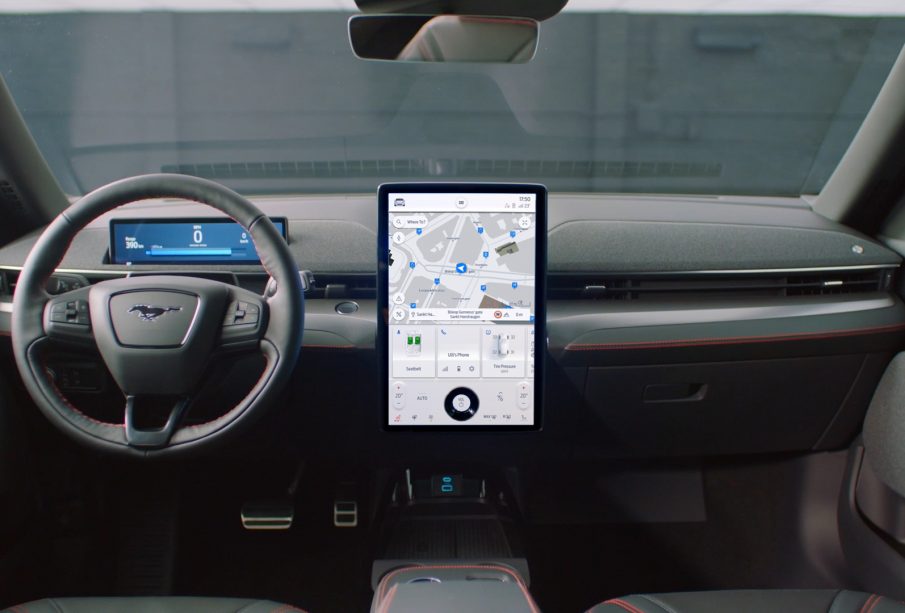 Στο εσωτερικό της Mustang Mach–E, η επόμενη γενιά του συστήματος SYNC διαθέτει μία full HD οθόνη αφής με διαγώνιο 15,5 ιντσών. Η μεγάλη, φιλική προς το χρήστη οθόνη είναι ευανάγνωστη, ενώ η διεπαφή της έχει αναθεωρηθεί για να προσφέρει πληροφορίες με οργανωμένο, εύπεπτο τρόπο. Το «παρών» δίνουν οι γνωστές χειρονομίες αφής (pinch, ζουμάρισμα, περιστροφή), ενώ το μπουτόν αφής στο κάτω μέρος της οθόνης προορίζεται για γρήγορη ρύθμιση της έντασης του ήχου για να ακούει κανείς μουσική ή να συμμετέχει σε τηλεδιασκέψεις.