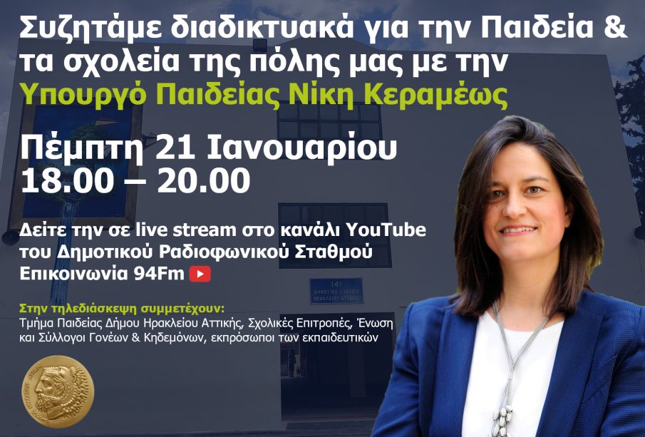 Την ευκαιρία να συνομιλήσουν απευθείας με την υπουργό Παιδείας, Νίκη Κεραμέως, δίνει στους εκπαιδευτικούς και τους γονείς, με παιδιά στα σχολεία της πόλης, ο Δήμος Ηρακλείου Αττικής. Ανταποκρινόμενος στο αίτημα του Υπουργείου Παιδείας, το οποίο το τελευταίο διάστημα ανοίγει διάλογο με τις τοπικές κοινωνίες για τα ζητήματα της εκπαίδευσης, ο Δήμος διοργανώνει σχετική τηλεδιάσκεψη την Πέμπτη 21 Ιανουαρίου από τις 18.00 έως τις 20.00.