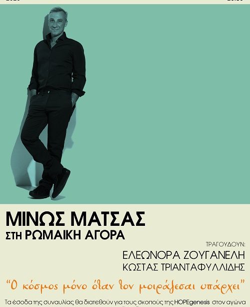 O Μίνως Μάτσας και η HOPEgenesis σας καλούν σε μια μουσική μυσταγωγία για μία και μοναδική βραδιά στον ανοικτό αρχαιολογικό χώρο της Ρωμαϊκής Αγοράς στους Αέρηδες, στην Πλάκα. Ο βραβευμένος συνθέτης με την συμμετοχή των εξαιρετικών ερμηνευτών Ελεωνόρας Ζουγανέλη και Κώστα Τριανταφυλλίδη καθώς και επτά διακεκριμένων μουσικών θα παρουσιάσει τούς πιο σημαντικούς κύκλους τραγουδιών της πορείας του την Πέμπτη, 10 Σεπτεμβρίου 2020 και ώρα 20.30.