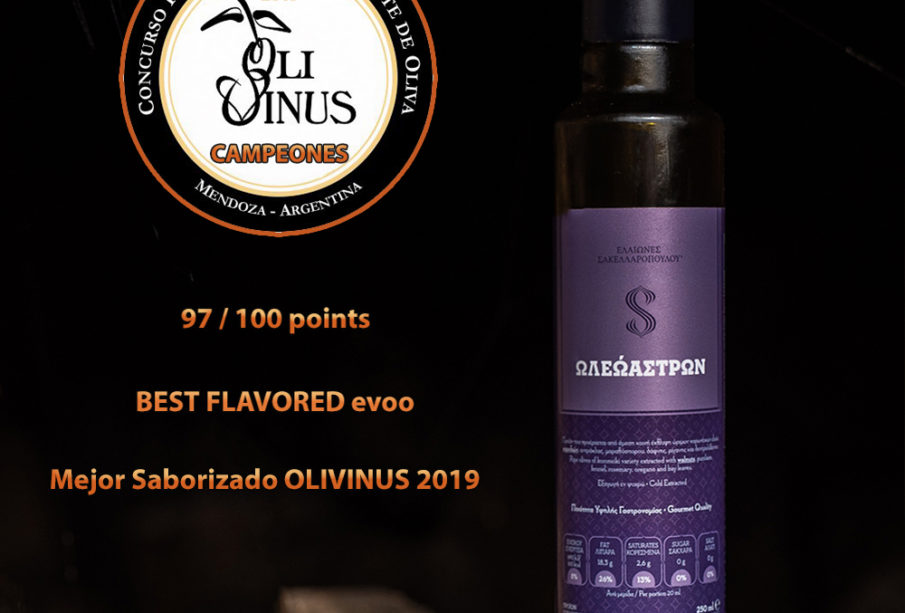 H μεγαλύτερη διάκριση με την οποία έχει τιμηθεί Ελληνικό ελαιόλαδο στην τελική φάση και στα 12 χρόνια του διεθνή διαγωνισμού της Αργεντινής, Olivinus international competition 2019,από τους μεγαλύτερους στην παγκόσμια κατάταξη και τον πλέον σημαντικό διαγωνισμό της Λατινικής Αμερικής και γενικότερα των χωρών του Νοτίου ημισφαιρίου,με υψηλή βαθμολογία 9 / 10, που του έχει δοθεί από το διεθνές σύστημα αξιολόγησης EVOO World Ranking.
