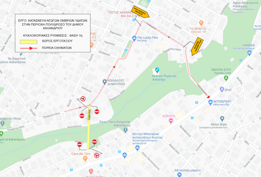 √ Η κυκλοφορία γι’ αυτούς που έρχονται από το κέντρο του Χαλανδρίου στην οδό Προφήτη Ηλία θα γίνεται ως εξής: είτε αριστερά στην οδό Οδυσσέα Ανδρούτσου, αριστερά στην οδό Καποδιστρίου, δεξιά οδός Π.Π. Γερμανού, δεξιά οδός Γιασεμιών συνέχεια κανονικά. Θα τοποθετηθούν απαγορευτικά Ρ7 στις απαραίτητες διασταυρώσεις.
