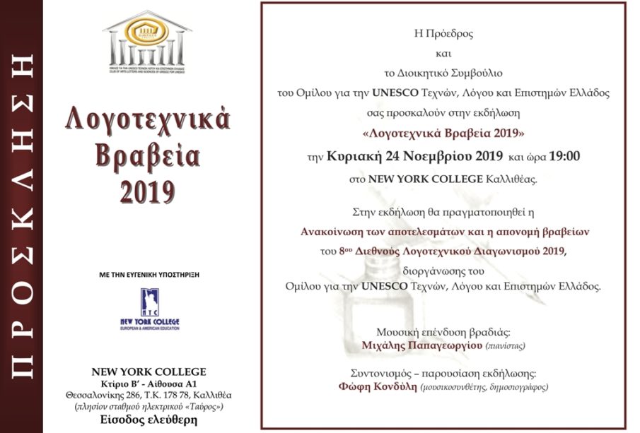 Ο Όμιλος για την UNESCO Τεχνών, Λόγου & Επιστημών Ελλάδος σας προσκαλεί στην εκδήλωση «Λογοτεχνικά Βραβεία 2019», την Κυριακή 24 Νοεμβρίου 2019 ώρα 19:00, στο NEW YORK COLLEGE Καλλιθέας, στην οποία θα ανακοινωθούν τα αποτελέσματα και θα απονεμηθούν τα βραβεία και τα αναμνηστικά διπλώματα του 8ου Διεθνούς Λογοτεχνικού Διαγωνισμού 2019.