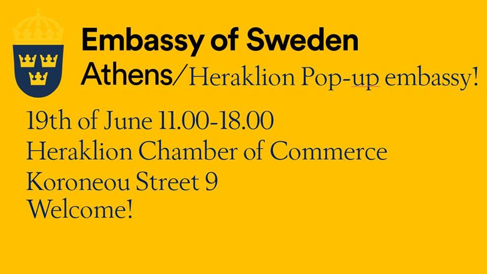 Παράλληλα, μέσω της καινοτόμας και εξωστρεφούς πρωτοβουλίας ‘’Pop – up Embassy’’, η Πρεσβεία της Σουηδίας θα λειτουργήσει για μία ημέρα στο Ηράκλειο! Συγκεκριμένα, η Πρέσβης της Σουηδίας, κα. Charlotte Sammelin, μαζί με το προσωπικό της Πρεσβείας θα παραμείνουν από τις 11.00 έως τις 18.00 στον χώρο του Επιμελητηρίου, στη διάθεση του κοινού, για να ενημερώσουν για τη Σουηδία και απαντήσουν σε πιθανές ερωτήσεις.