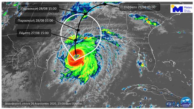 Ο τροπικός κυκλώνας του Ατλαντικού “Λάουρα” αφότου έπληξε την Καραϊβική με καταρρακτώδεις βροχές και θυελλώδεις ανέμους αφήνοντας πίσω του 24 νεκρούς και μεγάλες καταστροφές, μόλις εισήλθε στον Κόλπο του Μεξικού ενισχύθηκε γρήγορα σε τυφώνα Κατηγορίας 4 της κλίμακας Saffir-Simpson και την Τετάρτη 26/08 κινήθηκε γρήγορα προς της ακτές των πολιτειών Τέξας και Λουϊζιάνα των ΗΠΑ. Στην παρακάτω δορυφορική εικόνα παρουσιάζεται η προβλεπόμενη πορεία της “Λάουρα” τα επόμενα 24ωρα (μαύρη καμπύλη), με το λευκό πλαίσιο να περικλείει τις περιοχές όπου αναμένονται τα πιο ισχυρά φαινόμενα καθώς ο τυφώνας θα φτάσει στις ακτές των ΗΠΑ περίπου στις 11:00 ώρα Ελλάδας την Πέμπτη 27/08. Οι άνεμοι στην περιφέρεια της “Λάουρα” ήδη πνέουν με εντάσεις άνω των 200 km/h (ριπές ακόμη πιο ισχυρές), εκδηλώνονται καταρρακτώδεις βροχοπτώσεις και στις ακτές αναμένεται μεγάλη άνοδος της στάθμης της θάλασσας έως και 6 μέτρα πάνω από τα φυσιολογικά επίπεδα. Οι αρμόδιες Αρχές έχουν απομακρύνει πάνω από μισό εκατομμύριο κατοίκους από τις οικίες τους κοντά στις ακτές του Κόλπου του Μεξικού, ενώ υπολογίζεται ότι περίπου 3 εκατομμύρια άνθρωποι θα επηρεαστούν άμεσα από την κακοκαιρία μέχρι την Κυριακή 30/08.
