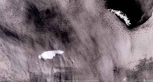 Στις παρακάτω εικόνες που έχουν ληφθεί στις 2 Νοεμβρίου 2020 από δορυφόρο της αποστολής Copernicus Sentinel 3, το παγόβουνο διακρίνεται στα αριστερά, ενώ η νήσος South Georgia πάνω δεξιά