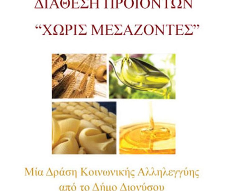 Θα θέλαμε να σας ενημερώσουμε ότι ο Δήμος Διονύσου συνεχίζει τη συμμετοχή του στο καταναλωτικό κίνημα “Χωρίς Μεσάζοντες” με τη διοργάνωση της 105ης κατά σειρά δράσης, που θα πραγματοποιηθεί την Τετάρτη 2 Σεπτεμβρίου 2020 στον Άγιο Στέφανο (επί της οδού Ηρώων Πολυτεχνείου) και ώρες από 8.00 έως 14.00.