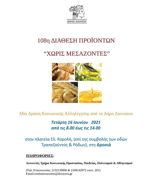 Σας ενημερώνουμε ότι ο Δήμος Διονύσου συνεχίζει τη συμμετοχή του στο καταναλωτικό κίνημα “Χωρίς Μεσάζοντες” με τη διοργάνωση της 108ης κατά σειρά δράσης, που θα πραγματοποιηθεί την Τετάρτη 16 Ιουνίου 2021 στη Δροσιά, στην πλατεία Ελ. Κορολή, επί της συμβολής των οδών Τραπεζούντος & Ρόδων και ώρες 8.00 έως 14.00.