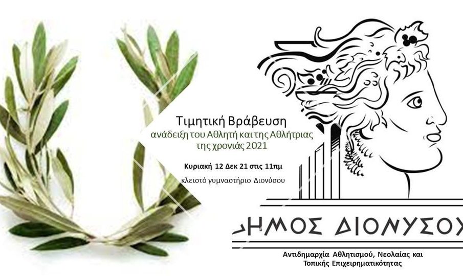 Ο Δήμος Διονύσου και η Αντιδημαρχία Αθλητισμού, Νεολαίας και Τοπικής Επιχειρηματικότητας θα βραβεύσει την Κυριακή 12 Δεκεμβρίου 21 στις 11πμ στο κλειστό γυμναστήριο Διονύσου , τον αθλητή και την αθλήτρια της χρονιάς (για τα έτη 2020-21) , εκ των αθλητικών συλλόγων που δραστηριοποιούνται στο Δήμο Διονύσου από όλα τα αθλήματα είτε ατομικά , είτε ομαδικά, κατά τη διάρκεια της δράσης μαζικού αθλητισμού «Open Day – Sports for Family».