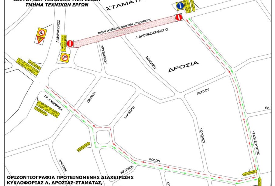 Μετά από συνεννόηση της Τεχνικής Υπηρεσίας του Δήμου, το τμήμα της Λεωφόρου Δροσιάς Σταμάτας όπου θα πραγματοποιηθούν οι συνδέσεις, θα είναι κλειστό από Δευτέρα έως και Παρασκευή, από τις 7:00 π.μ. έως και την ώρα λήξης των εργασιών (το αργότερο έως τις 17:00 μ.μ.). Μετά από αυτή την ώρα η κυκλοφορία θα πραγματοποιείται κανονικά. Επίσης, τα Σαββατοκύριακα η Λεωφόρος θα είναι ανοιχτή όλο το 24ωρο.