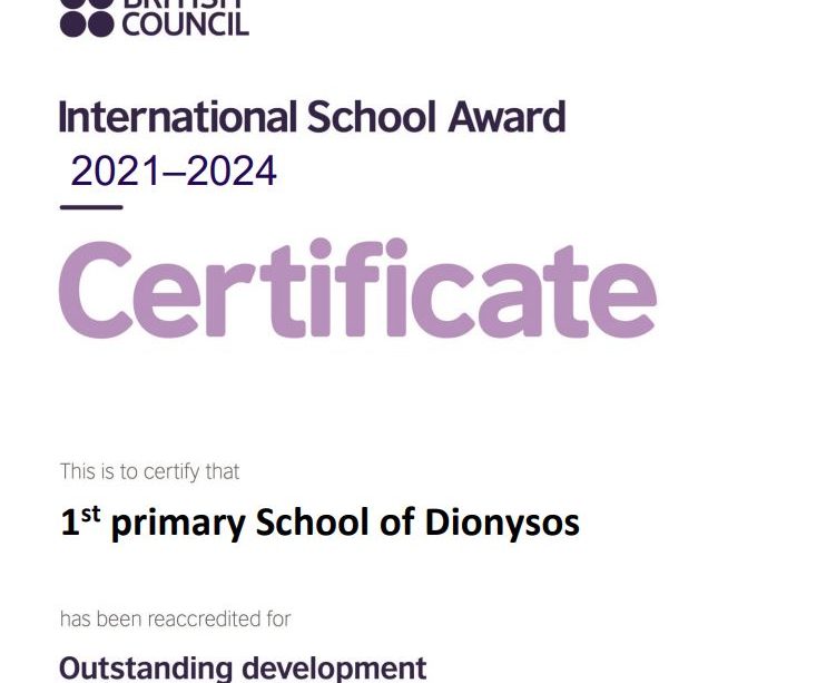 Οι δράσεις αξιολογήθηκαν από το British Council και επιβραβεύτηκαν στις αρχές Οκτωβρίου 2021 με την επαναδιαπίστευση του 1ου Δημοτικού Διονύσου ως International School για την τριετία 2021-2024.