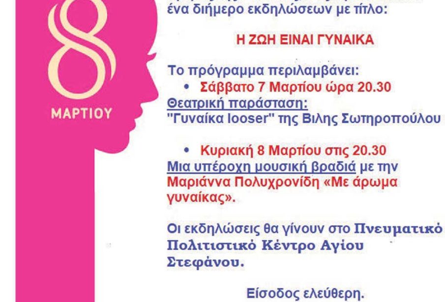 Ο Δήμος Διονύσου και η Αντιδημαρχία Πολιτισμού στο πλαίσιο του εορτασμού της “Ημέρας της Γυναίκας”, διοργανώνει το Σαββατοκύριακο 7 & 8 Μαρτίου 2020 Διήμερο εκδηλώσεων στο Πολιτιστικό Κέντρο Αγίου Στεφάνου.