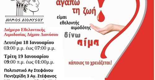 Δήμος Διονύσου: Διήμερο Εθελοντικής Αιμοδοσίας στον Άγιο Στέφανο, στις 18 & 19/1, με ραντεβού