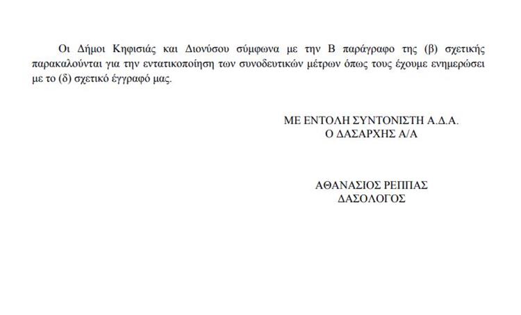Επισυνάπτεται έγγραφο του Δασαρχείου Πεντέλης, σύμφωνα με το οποίο αναστέλλεται η δράση δίωξης αγριόχοιρων που είχε προγραμματιστεί για την Τρίτη 31/8 στους Δήμους Διονύσου και Κηφισιάς.