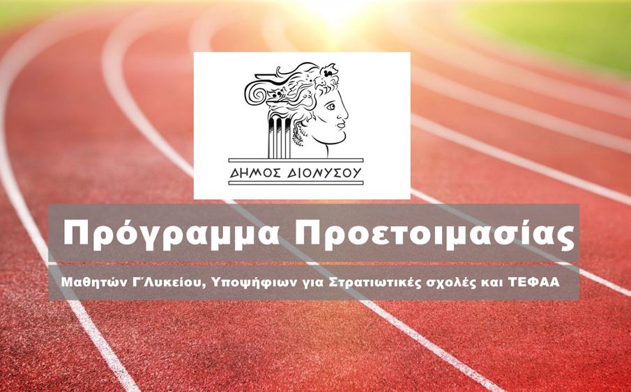 Η Αντιδημαρχία Παιδείας, Νέων Τεχνολογιών & Καινοτομίας και η Αντιδημαρχία Αθλητισμού, Νεολαίας και Τοπικής Επιχειρηματικότητας, σας ενημερώνουν ότι ο Δήμος Διονύσου από τη Δευτέρα 7 Ιουνίου ξεκινάει το Δωρεάν πρόγραμμα προετοιμασίας στους μαθητές και μαθήτριες Γ’ Λυκείου και Αποφοίτους που υπέβαλαν αίτηση και ενδιαφέρονται για την εισαγωγή τους σε στρατιωτικές σχολές και σχολές Τ.Ε.Φ.Α.Α.