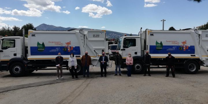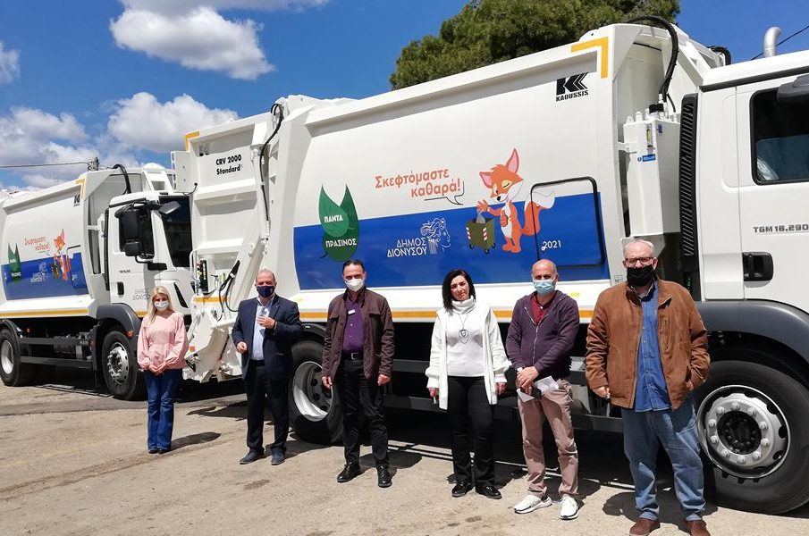 Παρουσία του Δημάρχου Διονύσου Γιάννη Καλαφατέλη, των Αντιδημάρχων Στέφανου Κριεμάδη, Γιούλας Λακαφώση και Γιάννη Τσουδερού καθώς και στελεχών και εργαζομένων της Διεύθυνσης Περιβάλλοντος, πραγματοποιήθηκε την Τρίτη 20 Απριλίου η παραλαβή δύο (2) νέων σύγχρονων απορριμματοφόρων οχημάτων τύπου πρέσας χωρητικότητας 16 m3, της εταιρίας «Α.ΚΑΟΥΣΗΣ Α.Ε.», τα οποία ανήκουν πλέον στο στόλο οχημάτων του Δήμου.